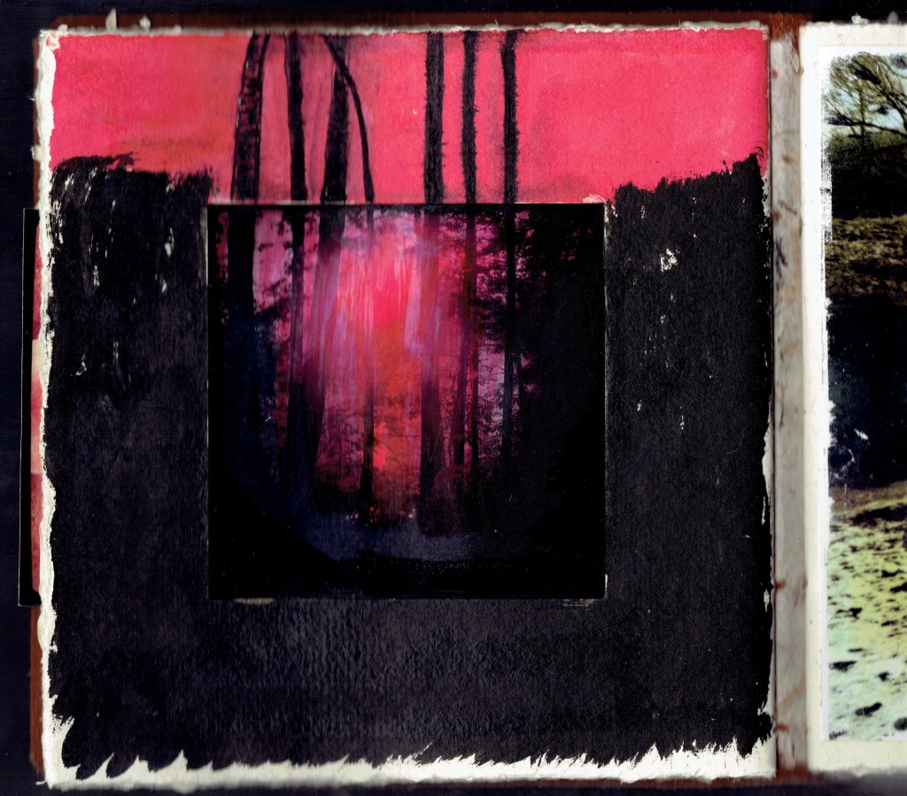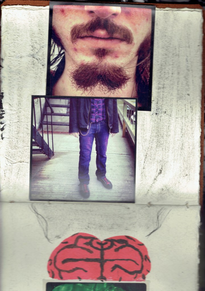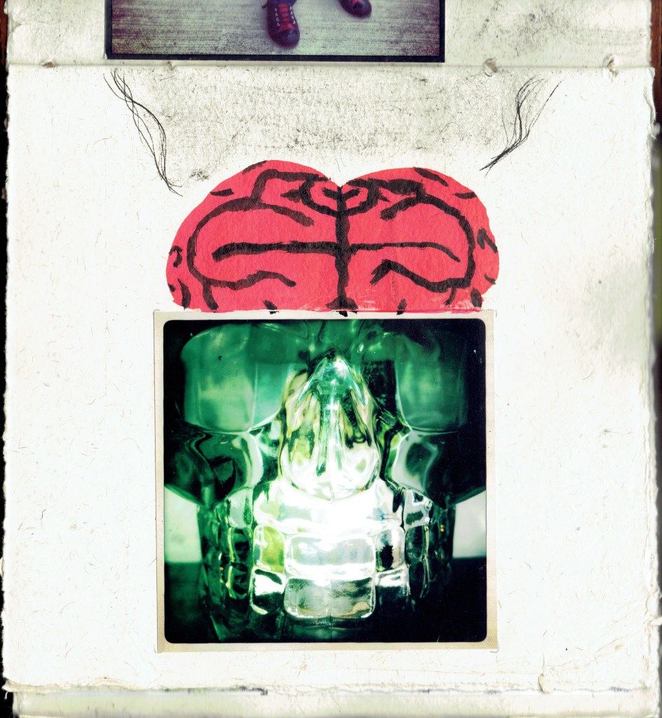 The photos are mostly instagram printouts. I used a nosebleed to make an inkblot at one point. It looked cool at first but dried into a gross copper brown color. I did not press those pages onto my scanner.